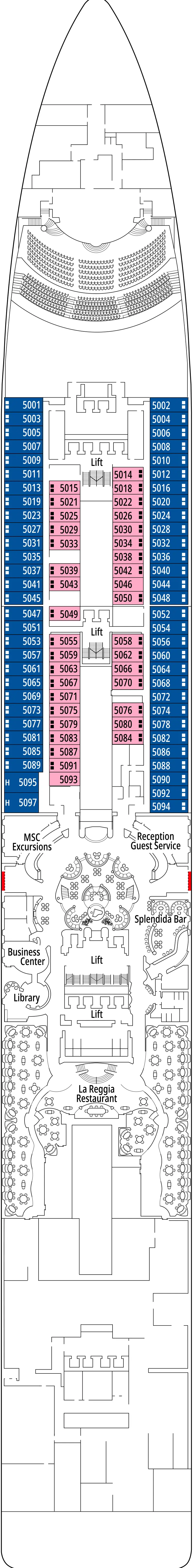 • 5è llit disponible a Premium Interior, Suite Premium Aurea amb hidromassatge, Grand Suite Aurea de dos dormitoris (cabines 11001, 12001 i 14001 tenen dos llits dobles i un llit pullman) i MSC Yacht Club Deluxe Suite.