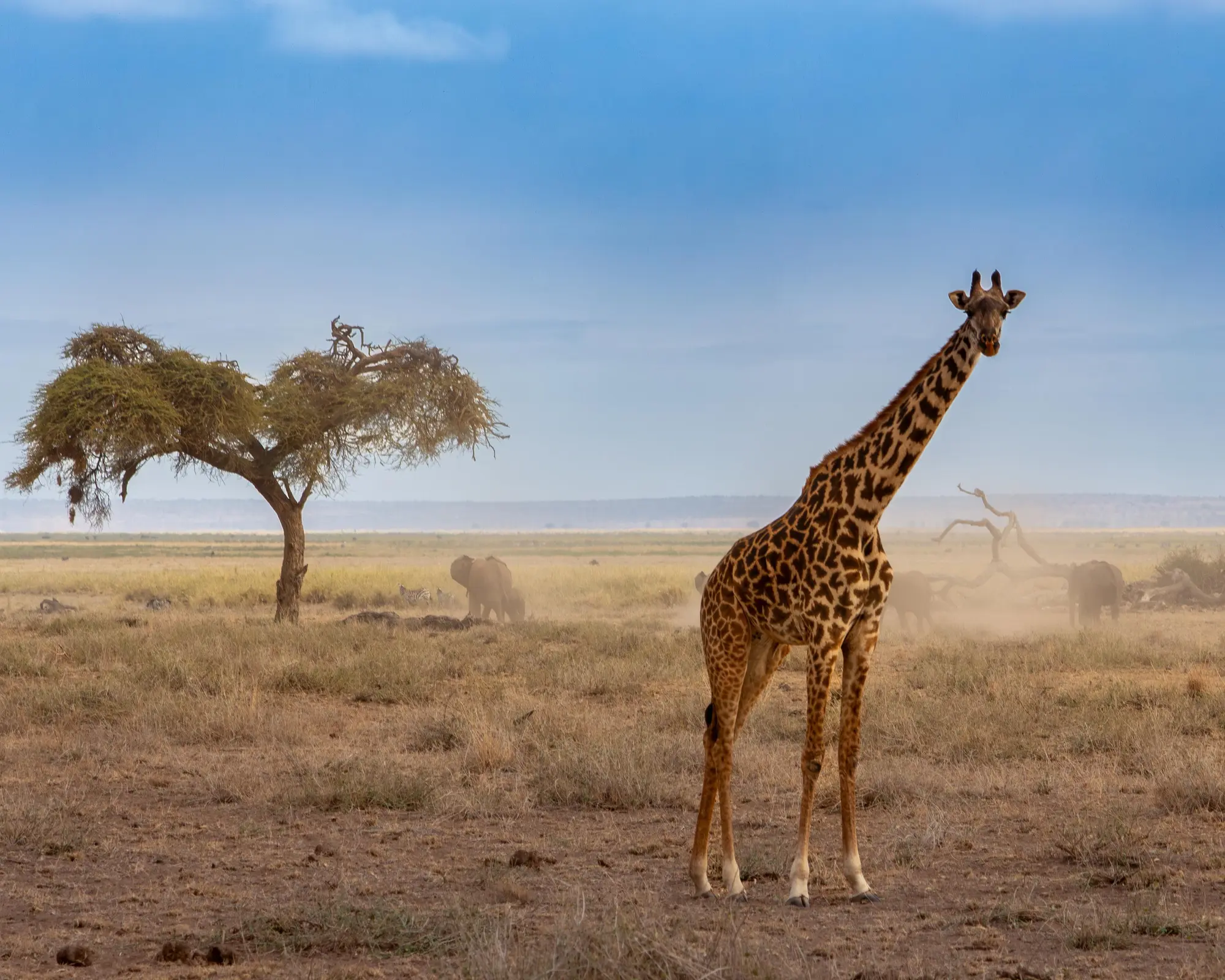 SABADO: NAIVASHA – NBO - AMBOSELI Desayuno temprano por la mañana. Tras el desayuno, salida hacia Nairobi a lo largo de la carretera de Nairobi/Mombasa para los primeros 125 KM (02 horas en coche) antes de girar por oeste hacia el Monte Kilimanjaro. Desde allí conducimos a través de país de la típica sabana africana salpicado de granjas locales y coloridos pastores Maasai con su ganado pastando. Llegada a tiempo para el almuerzo en el Lodge. A las 15:30 horas salidas para su primer safari fotográfico en el coche a través del Parque Nacional de Amboseli, famoso por sus grandes manadas de elefantes. Al atardecer, salida del parque hacia el Lodge para la cena y alojamiento en AMBOSELI SOPA LODGE