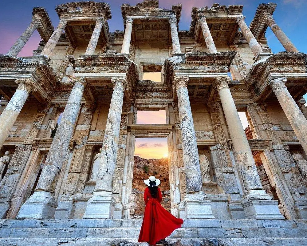 Breakfast at the hotel. Departure in the morning to Ephesus, Greco-Roman city, ancient capital of Asia Minor and one of the best preserved of antiquity, where the Temple of Hadrian, Temple of Trajan, the theater and the Library of Celsus are located. Visit to the House of the Virgin Mary, where he spent the last years of his life. Next, we will visit a leather goods gallery where we will learn about the famous production of lambskin garments of this region, at the end of the afternoon we continue to Kusadasi/or Izmir. Dinner at the hotel and overnight. (During the summer months of May -October the accommodation could be Izmir and its surroundings instead of Kusadasi)