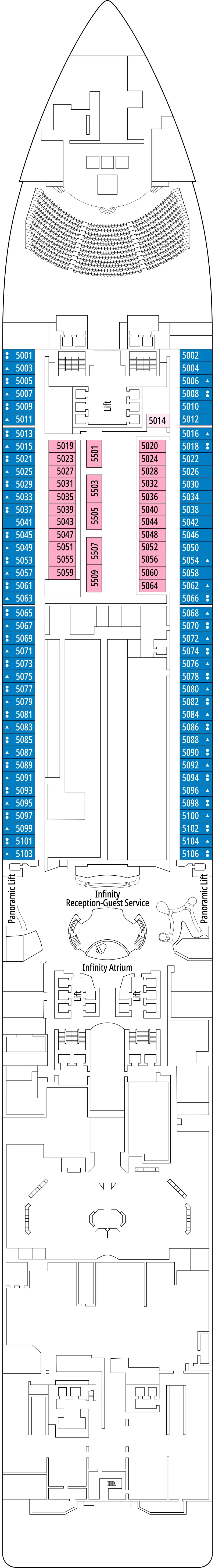 甲板: DECK 5 Elbe River - DECK 10 Ross Sea - DECK 11 Fernando De Noronha - DECK 12 Rapa Nui - DECK 13 Zakynthos
